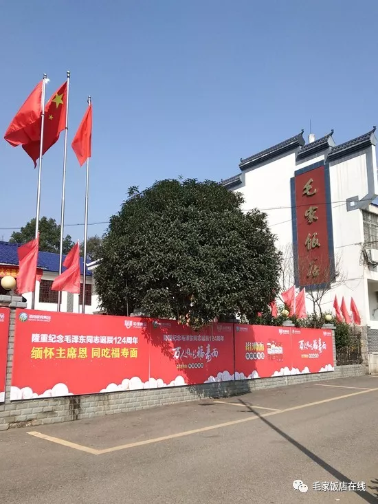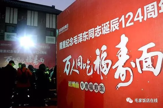 1993年12月6日,主席銅像在韶山落成。第二天,毛家飯店創(chuàng)始人湯瑞仁女士在毛家飯店門口張貼了一則廣告:為了慶祝毛主席的百歲生日,在主席生日的這天早晨,毛家飯店將隆重推出“福壽面”,全體鄉(xiāng)親和游客均可免費享用。12月26日一早,鄉(xiāng)親們和眾多游客紛紛擁向毛家飯店,“福壽面”宴一直從早晨吃到中午。一碗熱氣騰騰的“福壽面”,寄托著對毛主席綿綿的思念,也默默祈禱國泰民安,人民幸福健康。