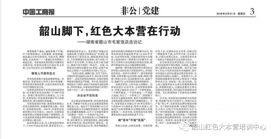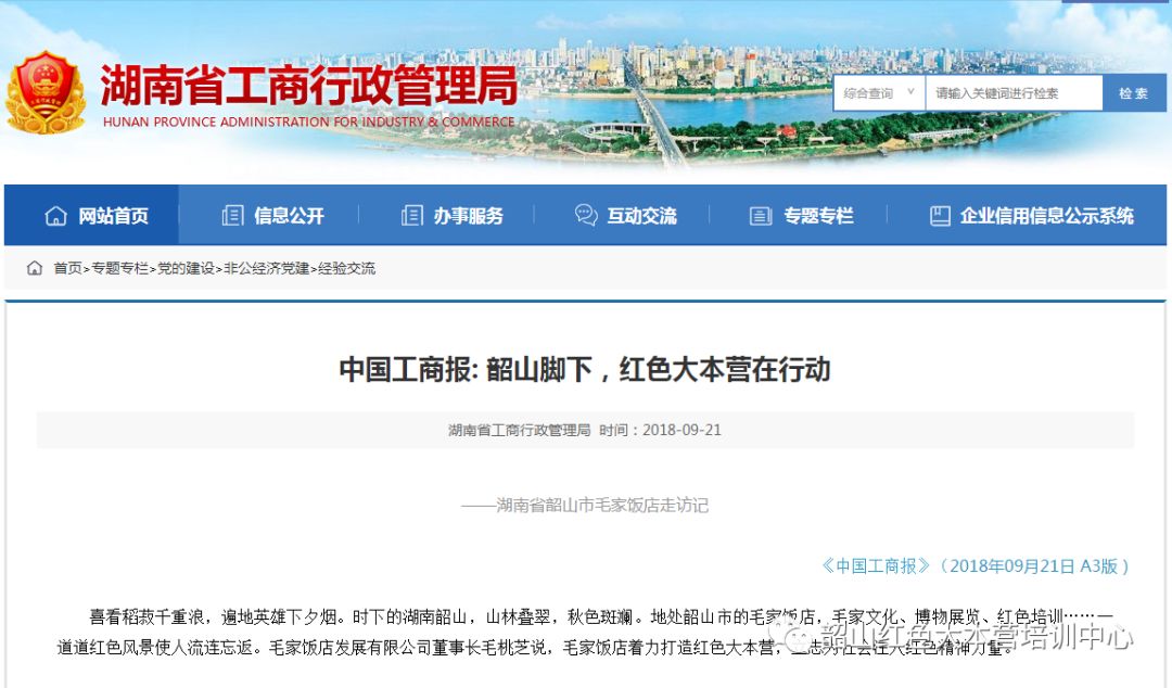 喜看稻菽千重浪,遍地英雄下夕煙。時(shí)下的湖南韶山,山林疊翠,秋色斑斕。地處韶山市的毛家飯店,毛家文化、博物展覽、紅色培訓(xùn)……一道道紅色風(fēng)景使人流連忘返。湖南韶山毛家飯店發(fā)展有限公司董事長(zhǎng)、韶山紅色大本營(yíng)培訓(xùn)中心校長(zhǎng)毛桃芝說,毛家飯店著力打造紅色大本營(yíng),立志為社會(huì)注入紅色精神力量。
