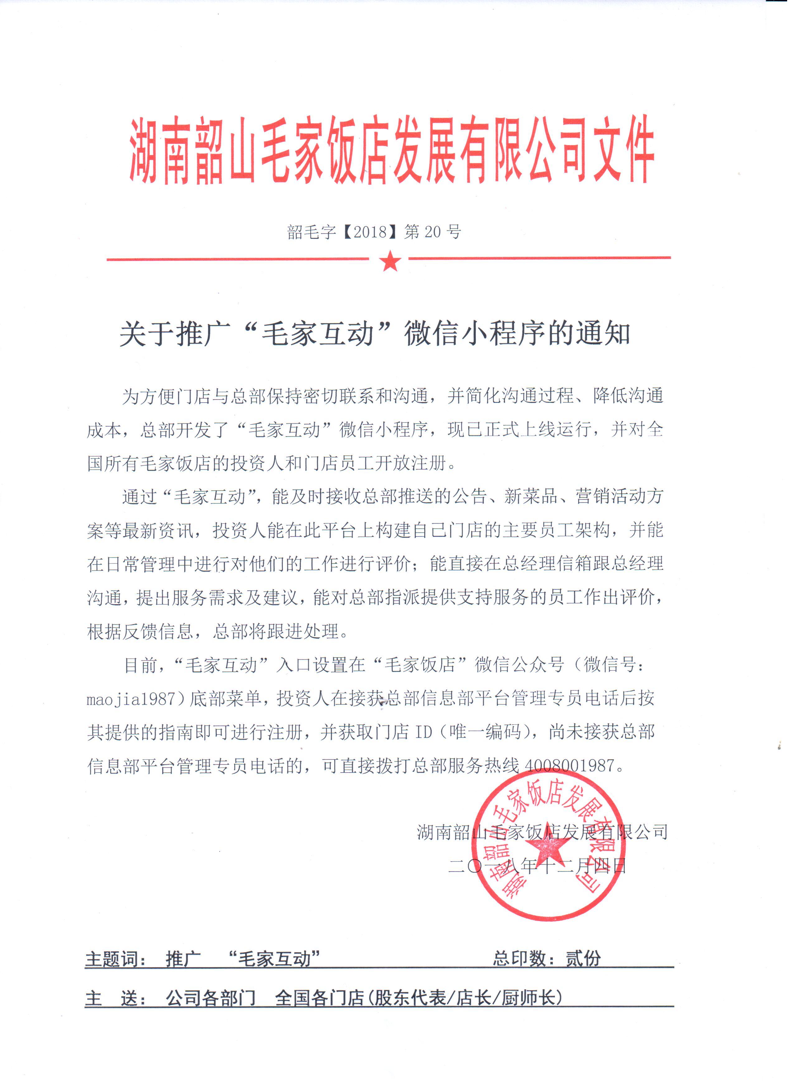 關(guān)于推廣“毛家互動”微信小程序的通知