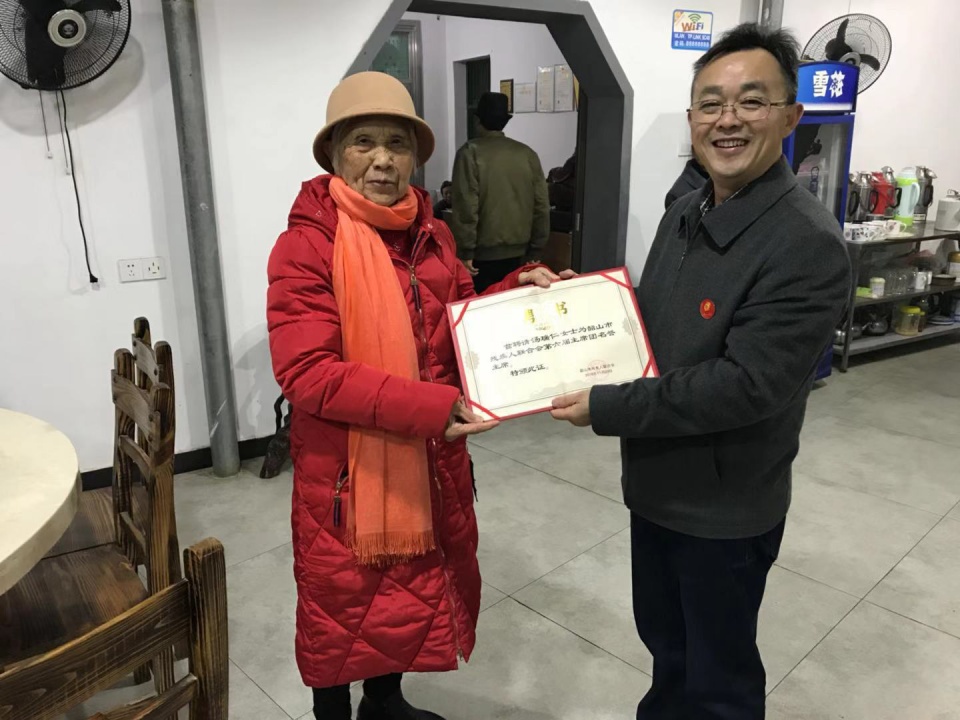 12月5日韶山市殘聯(lián)理事長將聘請證書送到“湯媽媽”手中,她非常開心,表示愿意為殘疾人事業(yè)盡心竭力。