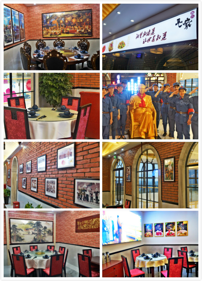 安徽合肥肥東吾悅廣場毛家飯店,店面設(shè)商場五樓,營業(yè)面積320平,可容納130人同時就餐。店內(nèi)以毛家4.0民國風(fēng)為格調(diào),紅色文化渲染的餐廳環(huán)境帶您體驗民國風(fēng)土人情的味道!