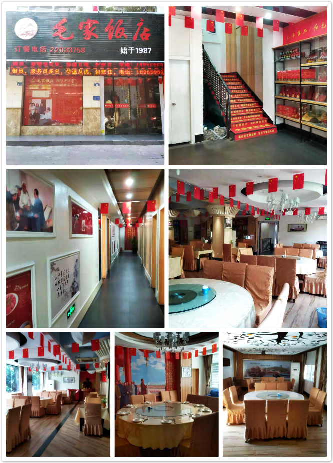 泉州毛家飯店位于福建省泉州市豐澤區(qū)迎津街81號(hào)。店內(nèi)五星紅旗飄揚(yáng),各式紅色文字印入眼簾,展柜整齊擺放著各類毛家食品,明亮寬闊的大廳有圓形和方形餐桌椅,包廂集中在過道兩邊,長(zhǎng)廊里懸掛著墻畫,整個(gè)飯店洋溢著濃濃的毛家文化和餐飲氣息。