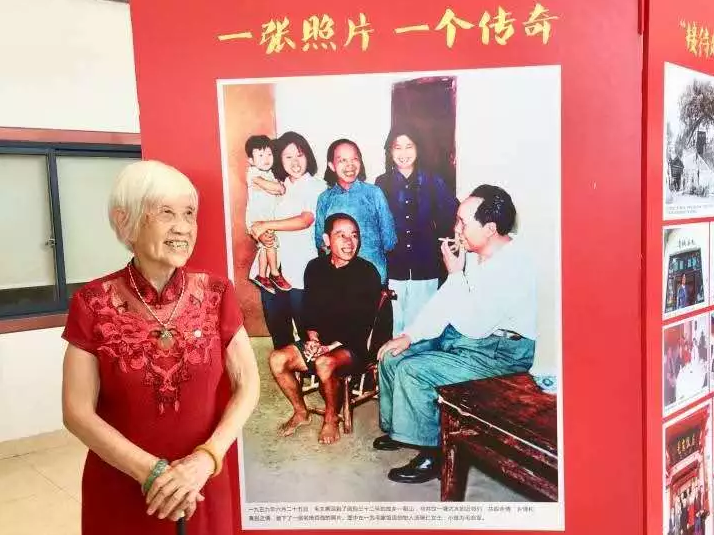 (湯瑞仁身后的照片是毛主席1959年6月25日回故鄉(xiāng)韶山和鄉(xiāng)親們在一起合影的情景,照片中左二是年輕時的湯瑞仁,懷中抱著的小孩是他的兒子毛命軍。)