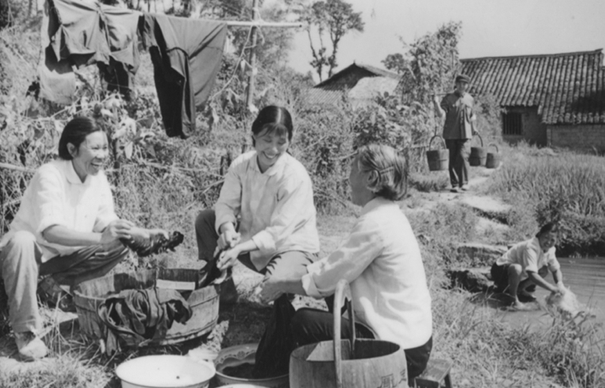 (1975年10月,湯瑞仁帶領婦女為警衛(wèi)班戰(zhàn)士洗衣。左一是湯瑞仁。)