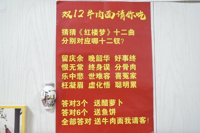 因臨近“雙十二”,一家面館的優(yōu)惠活動(dòng)竟然是答有關(guān)《紅樓夢(mèng)》的題,答對(duì)即可獲得相應(yīng)的優(yōu)惠,這場(chǎng)別出心裁的活動(dòng),自然吸引了不少人的關(guān)注??吹贸鰜?lái)面館老板是一位忠實(shí)的《紅樓夢(mèng)》粉絲,而且老板還是一位80年代的浙大文學(xué)碩士,看老板出的題,你能答對(duì)幾個(gè)呢?