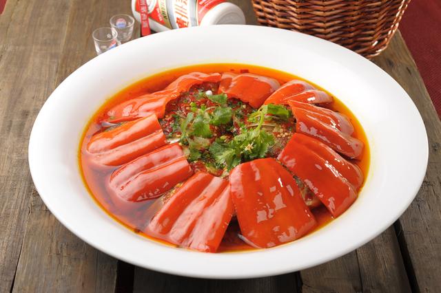 “江山一片紅”是一道湘菜,火紅的大片辣椒下是精心腌煮入味的魚(yú)頭,鮮紅的剁辣椒是不可或缺的點(diǎn)綴。鮮美的魚(yú)頭肉,浸入著剁辣椒的獨(dú)特味道,不經(jīng)意間就讓人緬懷起那些崢嶸歲月,令人肅然起敬,好在如今江山一片紅,不負(fù)一代偉人的期望。