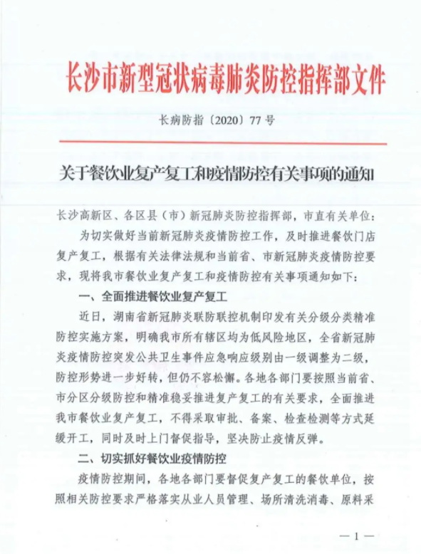 近日,長(zhǎng)沙市新型冠狀病毒肺炎疫情防控指揮部今天就餐飲業(yè)復(fù)產(chǎn)復(fù)工和疫情防控有關(guān)事項(xiàng),發(fā)布通知。