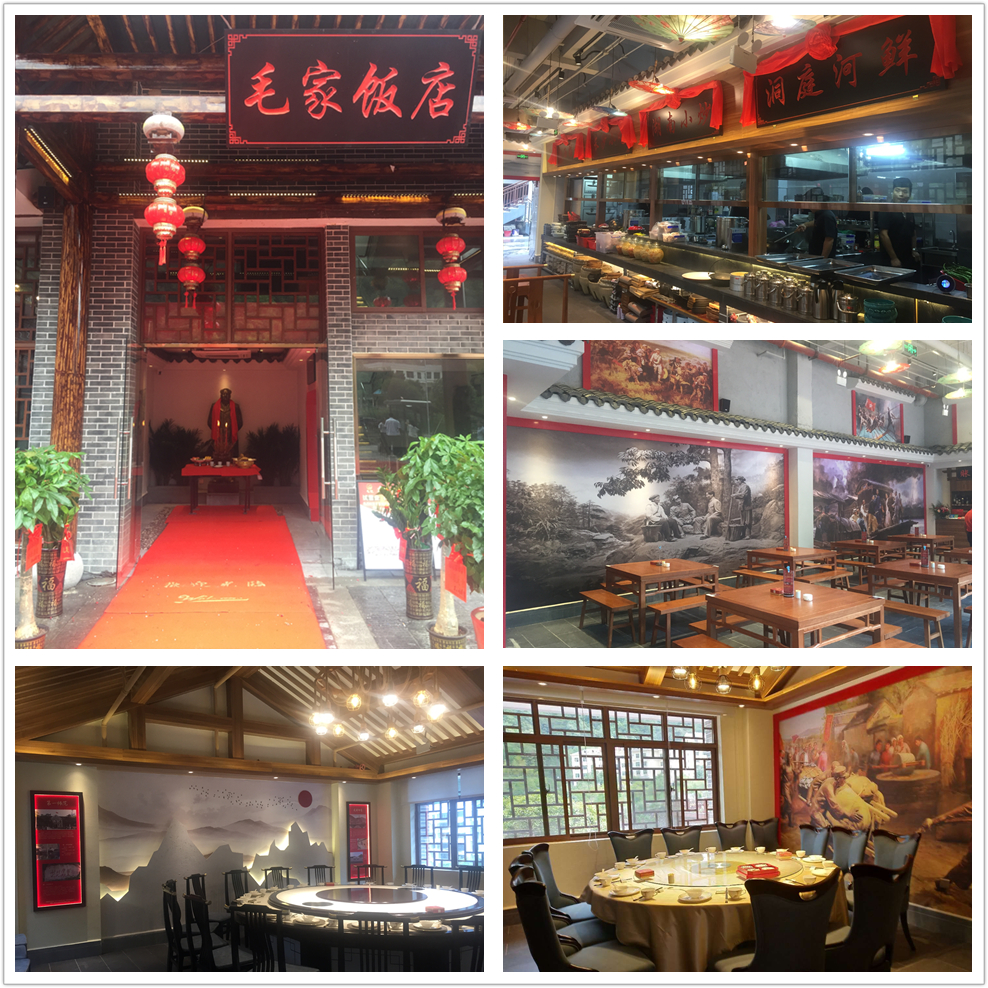 從樓面外部式樣、門頭,到內(nèi)部廳堂、包廂均蘊含了毛家特色文化設(shè)計和裝飾,充分展示了多彩的毛家文化和濃烈的主席文化氛圍。 這里有古樹、綠植、庭院、樓閣,綠意盎然,流水潺潺,翠鳥鳴唱,猶如置身山水田園,愜意舒適。