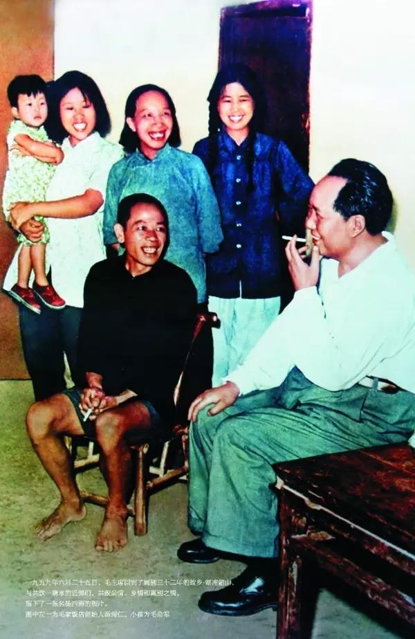 湯瑞仁,湖南湘潭人,出生于1930年,熟悉她的人都親切地稱她為“湯奶奶”。緣份從湯瑞仁嫁到韶山?jīng)_的毛凱清家開(kāi)始,他們家就住在毛澤東故居的斜對(duì)面,中間僅僅隔著一片水塘。1959年6月,毛澤東時(shí)隔32年再度回到湖南韶山老家時(shí),還曾到湯瑞仁家與鄉(xiāng)鄰們攀談。當(dāng)年與毛澤東攀談時(shí)的合影,至今仍掛在『毛家飯店』內(nèi)。