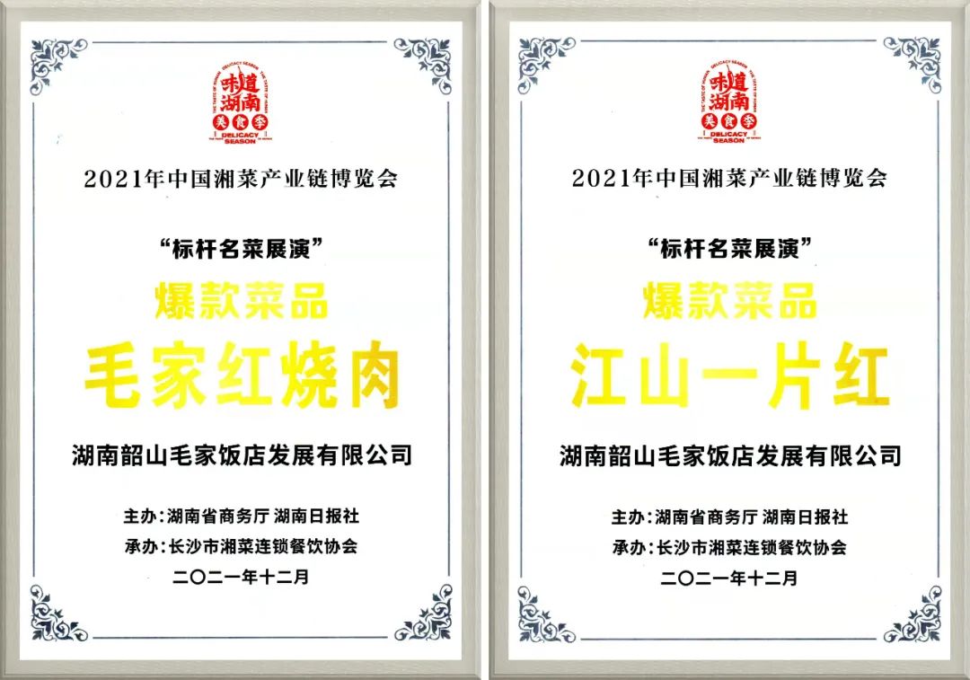 就在前不久的“中國湘菜產(chǎn)業(yè)鏈博覽會”標(biāo)桿名菜展演中,『毛家飯店』的毛家紅燒肉、江山一片紅榮登“爆款菜品榜”。