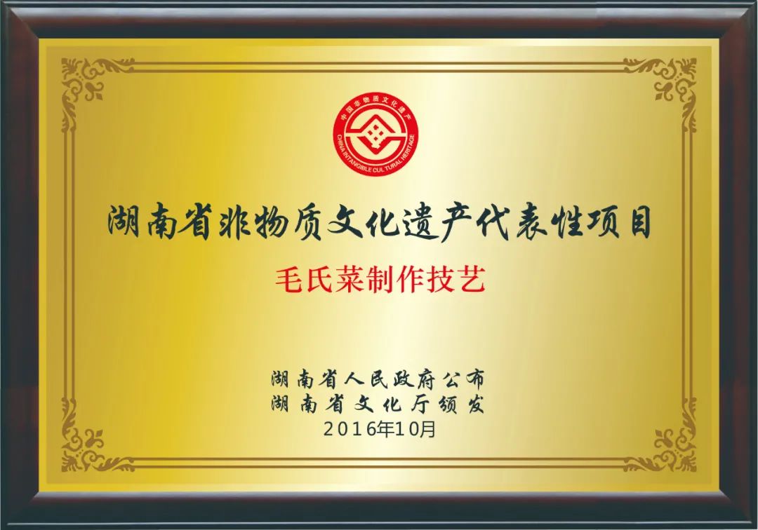 由于自身獨特的制作工藝與歷史寓意,『毛家飯店』的“毛氏菜制作技藝”已于2016年被列為湖南省非物質(zhì)文化遺產(chǎn)代表性項目,作為一種美食文化予以留存和保護。