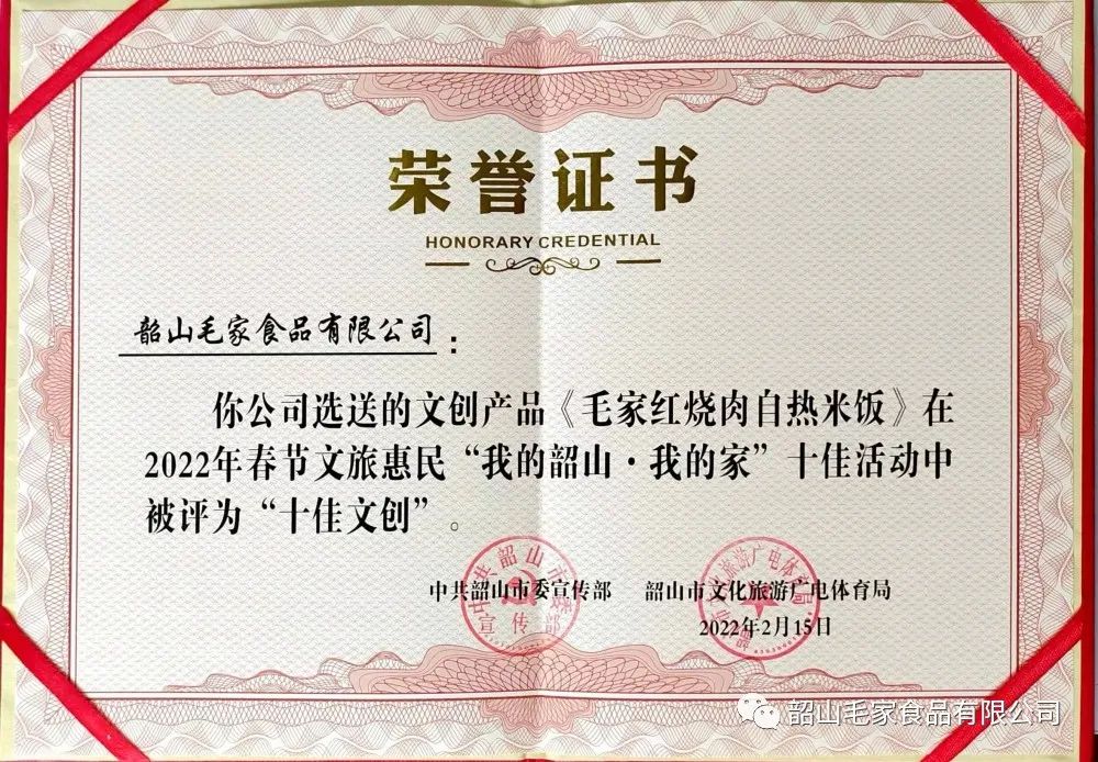 2月15日,韶山毛家食品有限公司選送的《毛家紅燒肉自熱米飯》在2022年春節(jié)文旅惠民“我的韶山·我的家”十佳活動(dòng)中被評為“十佳文創(chuàng)”。