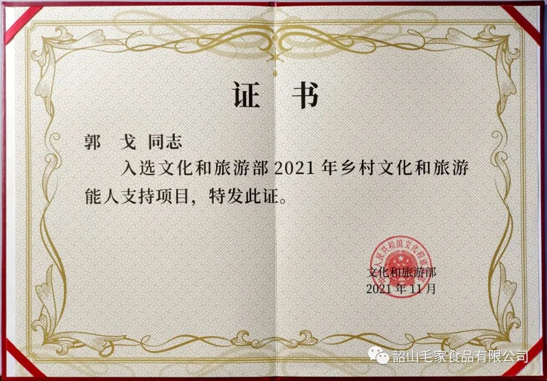 韶山毛家食品有限公司董事長郭戈入選“文化和旅游部2021年鄉(xiāng)村文化和旅游能人支持項目”,獲評“2021年國家鄉(xiāng)村文化和旅游能人”稱號。