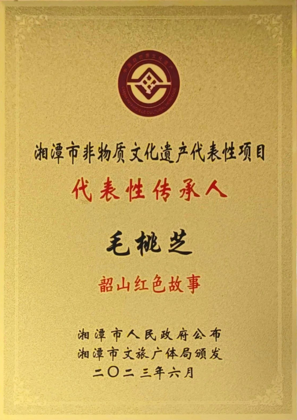當(dāng)天的開班儀式,為湘潭市第六批市級非物質(zhì)文化遺產(chǎn)代表性項(xiàng)目(增補(bǔ))名錄,第六批市級非物質(zhì)文化遺產(chǎn)代表性項(xiàng)目代表性傳承人以及2023年湘潭市級6個(gè)非遺工坊、3個(gè)非遺村鎮(zhèn)、2個(gè)非遺街區(qū)示范點(diǎn)進(jìn)行了授牌。毛家集團(tuán)董事長毛桃芝被認(rèn)定為湘潭市非物質(zhì)文化遺產(chǎn)代表性項(xiàng)目韶山紅色故事代表性傳承人。