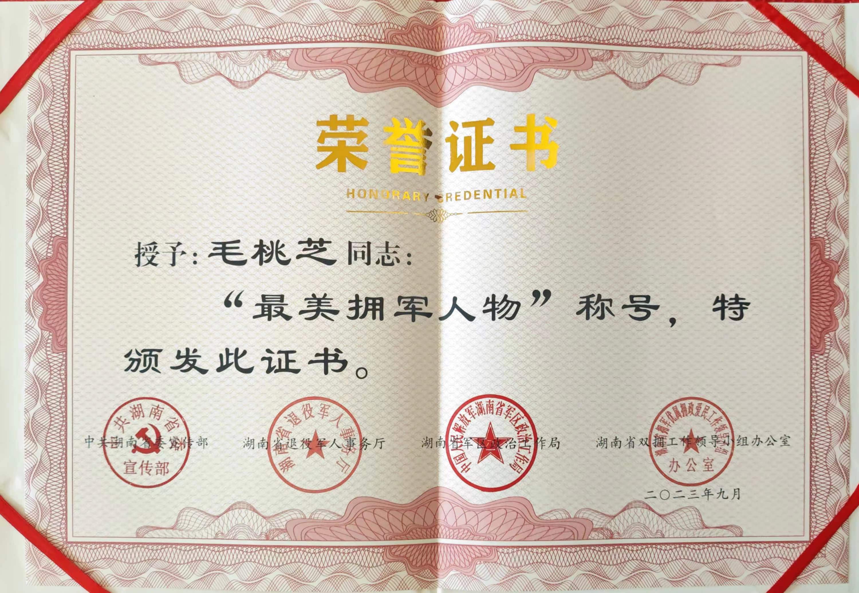 在湖南省的擁軍熱潮中,毛家集團董事長毛桃芝以其深厚的軍人家庭背景和堅定的擁軍情懷,在12月7日上午榮獲湖南省2023年度“最美擁軍人物”稱號,為全省樹立了擁軍優(yōu)屬的榜樣。