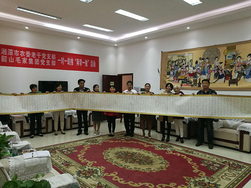 會后,湘潭市農(nóng)委老干支部吳力科書記向老齡黨員湯瑞仁老人贈送了他用小楷毛筆書寫的《黨章》全文條幅作品。