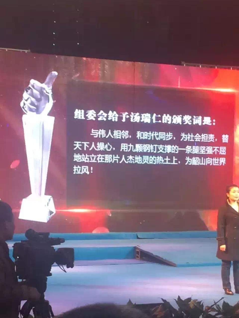 毛家飯店創(chuàng)始人湯瑞仁女士榮獲“湘潭市最美殘疾人”。組委會給予湯奶奶的頒獎詞是“與偉人相鄰,和時代同步,為社會擔(dān)責(zé),替天下人操心,用九顆鋼釘支撐的一條腿堅強(qiáng)不屈地站立在那片人杰地靈的熱土上,為韶山向世界拉風(fēng)!”