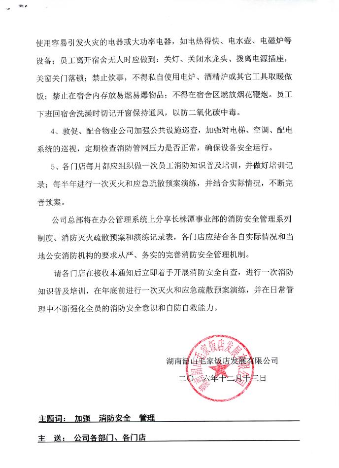公司總部將在辦公管理系統(tǒng)上分享長株潭事業(yè)部的消防安全管理系列制度、消防滅火疏散預(yù)案和演練記錄表,各門店應(yīng)結(jié)合各自實(shí)際情況和當(dāng)?shù)毓蚕罊C(jī)構(gòu)的要求從嚴(yán)、務(wù)實(shí)的完善消防安全管理機(jī)制。