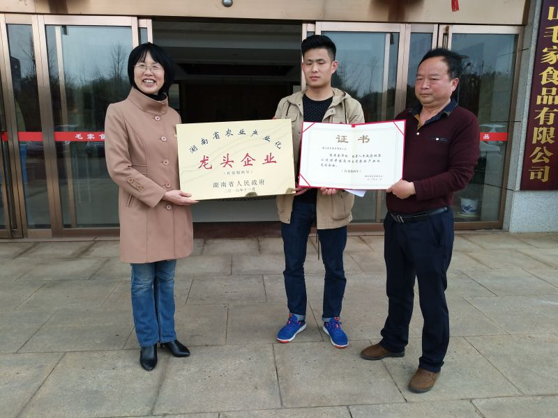 2017年新春伊始,毛家食品喜事連連,繼被認(rèn)定為“湖南省高新技術(shù)企業(yè)”后,公司又被湖南省人民政府授予“湖南省農(nóng)業(yè)產(chǎn)業(yè)化龍頭企業(yè)”稱號(hào)。2月20日下午,毛家食品董事長毛桃芝女士接過了沉甸甸的榮譽(yù)牌匾和證書。