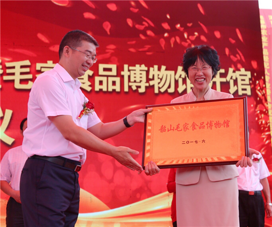 韶山市人民政府市長唐杰向毛家集團(tuán)董事長毛桃芝授予“毛家食品博物館”牌匾