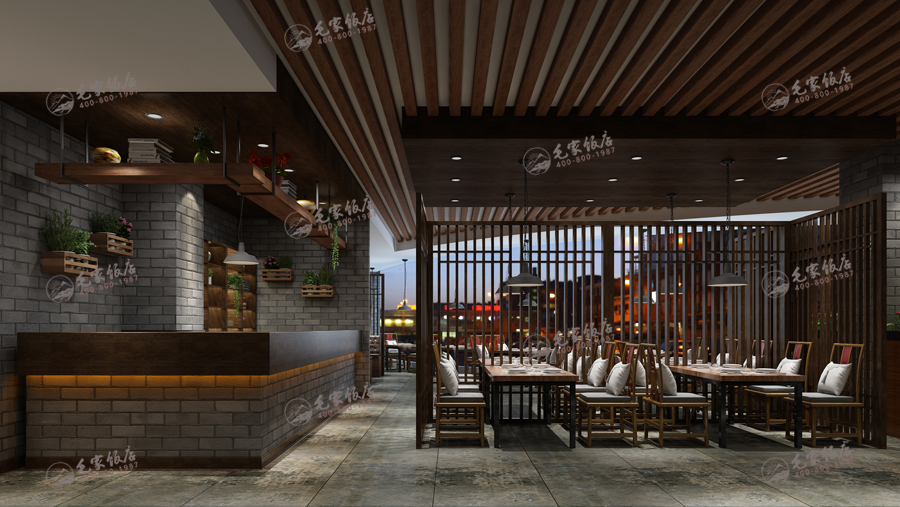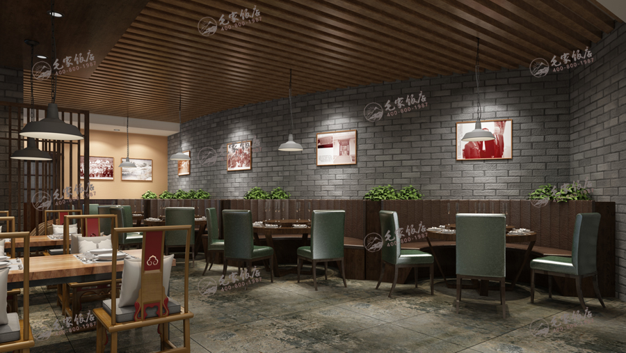 傳統(tǒng)質(zhì)樸是毛家飯店新概念版的中心思路,在這個基礎(chǔ)上,采用大面積的紅磚來突出質(zhì)樸的環(huán)境氛圍,以點(diǎn)成面,給人一種傳統(tǒng)質(zhì)樸的感覺,并用木材來柔化紅磚硬朗的感覺,點(diǎn)綴上綠植,讓人回憶起熟悉的場景。