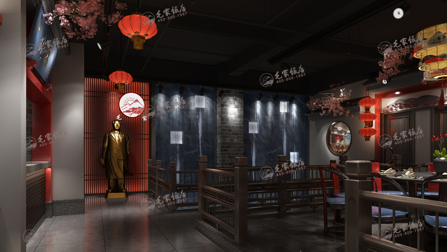在新青年版本的基礎(chǔ)上,繼續(xù)升級而來,打造更符合現(xiàn)代的時尚版本,用現(xiàn)代時尚的建筑元素和裝飾元素替代復(fù)雜的傳統(tǒng)元素,更加突出毛家的紅色主題和文化,給顧客耳目一新的感覺,讓場景更加時尚,符合新時代的裝飾風(fēng)格和效果。
