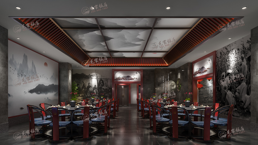 毛家的文化空間,基于對中國傳統(tǒng)文化及紅色文化深刻的皈依,在傳統(tǒng)的基礎(chǔ)上又恰到好上的融合了現(xiàn)代的設(shè)計元素,將時尚與餐飲文化相結(jié)合將毛家企業(yè)文化融于空間之中,讓顧客在品嘗美味的同時也能口味出毛家獨(dú)特企業(yè)文化的滲透力。大廳及包房文化把主席的革命足跡巧妙的融入到其空間中,整體的文化布置將營造一個個性、人文、張揚(yáng)而又不失沉穩(wěn)的餐飲空間,并使毛家獨(dú)特的毛文化形成更多可以慢慢品的內(nèi)容。
