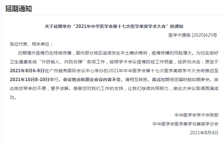 近期境外疫情仍在持續(xù)傳播,國內(nèi)部分地區(qū)連續(xù)發(fā)生本土確診病例,疫情傳播的風(fēng)險(xiǎn)增大。為切實(shí)做好衛(wèi)生健康系統(tǒng)“外防輸入、內(nèi)防反彈”各項(xiàng)工作,按照學(xué)術(shù)會議疫情防控工作預(yù)案,經(jīng)研究決定:原定于2021年8月6-8日在廣州越秀國際會議中心舉辦的2021年中華醫(yī)學(xué)會第十七次醫(yī)學(xué)美容學(xué)術(shù)大會將推遲至2021年10月8-10日舉行。會議地點(diǎn)和原定會議內(nèi)容不變。請相互轉(zhuǎn)告。真誠地期待您屆時(shí)能如期參會。由此給您帶來的不便,望予諒解。感謝您對我們工作的支持,讓我們繼續(xù)共同努力,使此次會議取得圓滿成功。