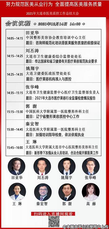 12月14日下午,2021年大連市醫(yī)療美容質(zhì)控中心工作總結(jié)大會(huì)在線上成功舉行,大連市200多家醫(yī)美機(jī)構(gòu)負(fù)責(zé)人和醫(yī)務(wù)部門負(fù)責(zé)人及醫(yī)美從業(yè)者2300多人線上參會(huì)。本次大會(huì)由大連市衛(wèi)生健康監(jiān)督中心、大連市醫(yī)療美容質(zhì)量控制中心主辦,大連市衛(wèi)建委多個(gè)部門主管領(lǐng)導(dǎo)和行業(yè)專家出席了會(huì)議。
