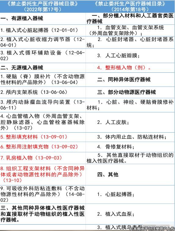 與2014年的版本相比,新修訂的《目錄》,去除了生產(chǎn)工藝已較為成熟的產(chǎn)品,如腔靜脈濾器、心血管栓塞器械、植入式胰島素泵;新增及細化了近年來出現(xiàn)較多可疑不良事件的醫(yī)美植入材料:整形填充材料(13-09-01)、整形用注射填充物(13-09-02)、乳房植入物(13-09-03)、組織工程支架材料(13-10)。