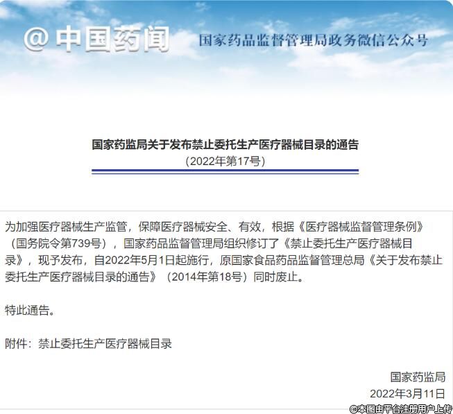 《禁止委托生產(chǎn)醫(yī)療器械目錄(2022年第17號)》是在法規(guī)和標準的不斷完善、科學技術的不斷發(fā)展之下進行的適時的調整?!赌夸洝返膶嵤?,將對降低相關產(chǎn)品不良事件、保障產(chǎn)品安全發(fā)揮出有益作用。