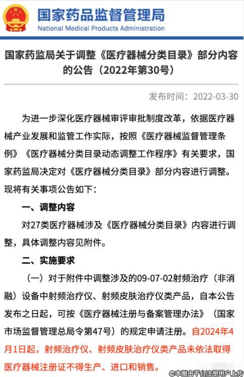 3月30日,國(guó)家藥監(jiān)局發(fā)布“關(guān)于調(diào)整《醫(yī)療器械分類目錄》部分內(nèi)容的公告”(全文鏈接 → t.ly/kRDQ),公告顯示,自2024年4月1日起,射頻治療儀、射頻皮膚治療儀類產(chǎn)品未依法取得醫(yī)療器械注冊(cè)證不得生產(chǎn)、進(jìn)口和銷售。
