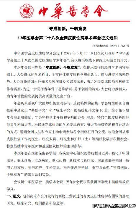 中華醫(yī)學(xué)會(huì)皮膚性病學(xué)分會(huì)定于2022年6月16-19日在沈陽召開“中華醫(yī)學(xué)會(huì)第二十八次全國皮膚性病學(xué)術(shù)年會(huì)”,會(huì)議將采取線下和線上相結(jié)合的形式。