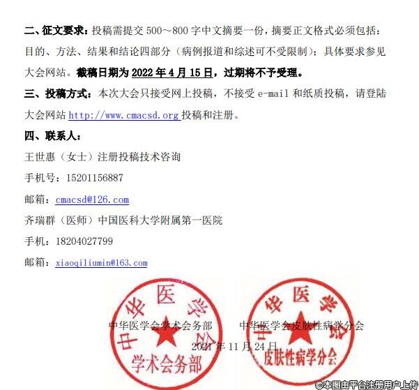 年會(huì)歷來重視廣大醫(yī)師積極主動(dòng)參與,重視稿件的征集。學(xué)會(huì)將繼續(xù)在自由投稿中遴選出“基礎(chǔ)研究”和“臨床研究”的高質(zhì)量論文各10篇,給予免下屆年會(huì)注冊(cè)費(fèi)鼓勵(lì)。年會(huì)堅(jiān)持學(xué)術(shù)開放和爭鳴的辦會(huì)理念,特向全國皮膚科醫(yī)師征集學(xué)術(shù)演講者。為保證完成相關(guān)的學(xué)術(shù)交流內(nèi)容,演講者采取特邀和自薦結(jié)合的方式,邀請(qǐng)全國皮膚科專家主動(dòng)申請(qǐng)參與各個(gè)相應(yīng)欄目的交流,歡迎全國從事皮膚性病工作的醫(yī)生、研究人員、研究生和護(hù)師(士)等踴躍投稿并積極參會(huì),特別鼓勵(lì)中青年醫(yī)師和基層醫(yī)院醫(yī)師的主動(dòng)參與。