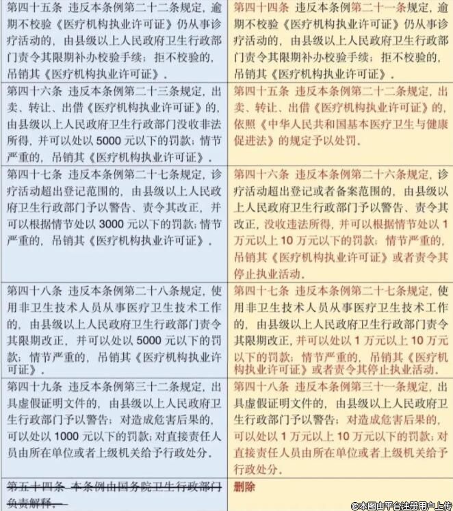 將第四十六條改為第四十五條,修改為”違反本條例第二十二條規(guī)定,出賣、轉(zhuǎn)讓、出借《醫(yī)療機(jī)構(gòu)執(zhí)業(yè)許可證》的,依照《中華人民共和國基本醫(yī)療衛(wèi)生與健康促進(jìn)法》的規(guī)定予以處罰。“