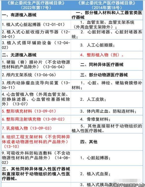 與2014年的版本相比,新修訂的《目錄》去除了生產(chǎn)工藝已較為成熟的產(chǎn)品,如腔靜脈濾器、心血管栓塞器械、植入式胰島素泵;新增及細(xì)化了近年來(lái)出現(xiàn)較多可疑不良事件的醫(yī)美植入材料:整形填充材料、整形用注射填充物、乳房植入物、組織工程支架材料。