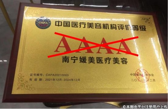 南寧媛美醫(yī)療美容偽造的4A等級(jí)牌匾
