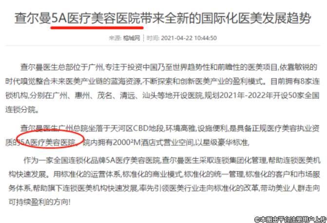 查爾曼醫(yī)生連鎖集團(tuán)關(guān)于獲評(píng)5A醫(yī)療美容醫(yī)院虛假宣傳網(wǎng)頁(yè)