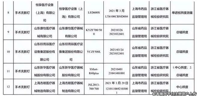7臺手術(shù)無影燈分別為山東新華醫(yī)療器械股份有限公司、河北誼安奧美醫(yī)療設(shè)備有限公司、上海吉順醫(yī)療器械制造有限公司等7家企業(yè)生產(chǎn),涉及保護(hù)接地阻抗、中心照度、單遮板照度測量、總輻照度等不符合標(biāo)準(zhǔn)規(guī)定。