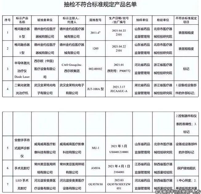 4月20日,國家藥監(jiān)局關(guān)于發(fā)布國家醫(yī)療器械監(jiān)督抽檢結(jié)果的通告,其中德州金約應(yīng)醫(yī)療器械有限公司生產(chǎn)的椎間融合器2批次,表面粗糙度不符合標(biāo)準(zhǔn)規(guī)定;半導(dǎo)體激光治療機(jī)1臺:CAO Group,Inc. 西爾歐集團(tuán)生產(chǎn)的半導(dǎo)體激光治療機(jī)標(biāo)記不符合標(biāo)準(zhǔn)規(guī)定;武漢金萊特光電子有限公司生產(chǎn)二氧化碳激光治療機(jī)1臺外部標(biāo)記、控制器件和儀表的準(zhǔn)確性、標(biāo)記不符合標(biāo)準(zhǔn)規(guī)定;威海威高醫(yī)療影像科技有限公司生產(chǎn)的手持式超聲診斷設(shè)備外部標(biāo)記不符合標(biāo)準(zhǔn)規(guī)定。
