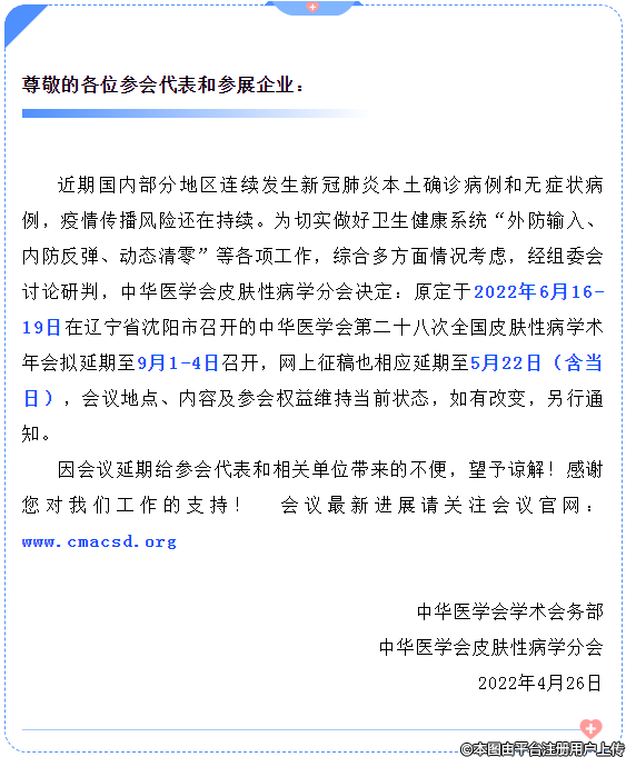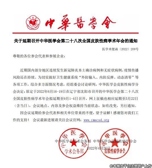 因受疫情影響,原定于2022年6月16-19日在遼寧省沈陽市召開的中華醫(yī)學(xué)會第二十八次全國皮膚性病學(xué)術(shù)年會擬延期至9月1-4日召開。,網(wǎng)上征稿也相應(yīng)延期至5月22日(含當(dāng)日)。