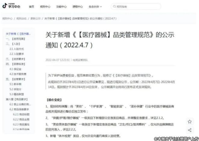 在醫(yī)療美容器械領(lǐng)域,抖音電商明確了產(chǎn)品入駐形式,美容美體醫(yī)療器械“一級(jí)類目下新增的衛(wèi)生/傷口/醫(yī)用敷料實(shí)行類目定準(zhǔn),即定向邀約部分商家,并在審查許可后才允許其經(jīng)營。同時(shí),抖音對(duì)上述產(chǎn)品的推廣形式提出明確要求,僅允許在商品櫥窗、抖音商城等貨架形式進(jìn)行售賣,尚不允許商家、達(dá)人以直播、短視頻形式進(jìn)行推廣。