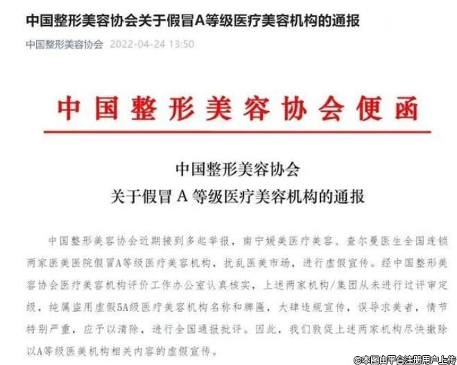 2022年4月24日,中國(guó)整形美容協(xié)會(huì)發(fā)布消息,南寧媛美醫(yī)療美容、查爾曼醫(yī)生全國(guó)連鎖兩家醫(yī)美醫(yī)院假冒A等級(jí)醫(yī)療美容機(jī)構(gòu),擾亂醫(yī)美市場(chǎng),進(jìn)行虛假宣傳。經(jīng)中國(guó)整形美容協(xié)會(huì)醫(yī)療美容機(jī)構(gòu)評(píng)價(jià)工作辦公室認(rèn)真核實(shí),上述兩家機(jī)構(gòu)/集團(tuán)從未進(jìn)行過(guò)評(píng)審定級(jí),純屬盜用虛假5A級(jí)醫(yī)療美容機(jī)構(gòu)名稱(chēng)和牌匾,大肆違規(guī)宣傳,誤導(dǎo)求美者,情節(jié)特別嚴(yán)重,應(yīng)予以清除,進(jìn)行全國(guó)通報(bào)批評(píng)。