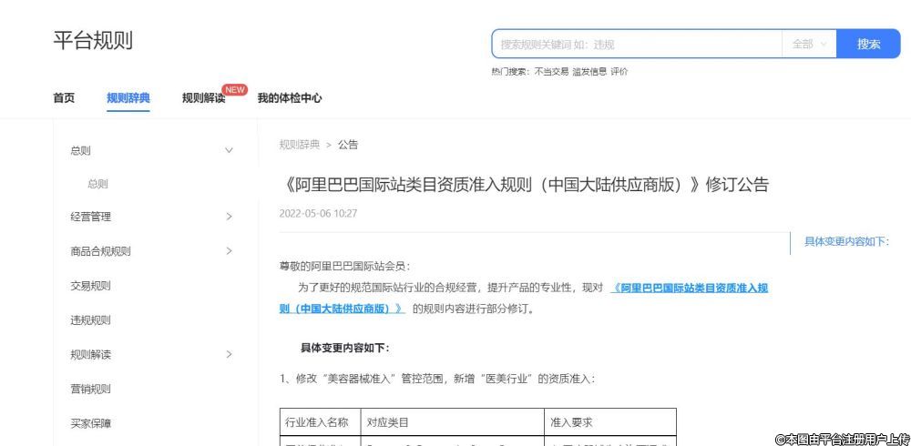 5月6日消息,今日,阿里巴巴國際站公布公告,對《阿里巴巴國際站類目資質(zhì)準入規(guī)則(中國大陸供應(yīng)商版)》的規(guī)則內(nèi)容進行部分修訂,將于2022年5月12日起正式生效執(zhí)行。