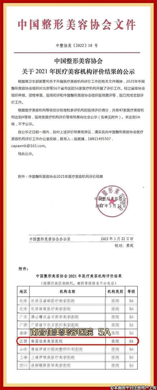 2022年3月22日,中國(guó)整形美容協(xié)會(huì)正式公布了2021年醫(yī)療美容機(jī)構(gòu)評(píng)價(jià)結(jié)果,南昌佳美美容醫(yī)院高分通過(guò)5A評(píng)審,榮膺“5A級(jí)醫(yī)療美容醫(yī)院”。目前,全江西省只有南昌佳美一家上榜5A醫(yī)美認(rèn)證。