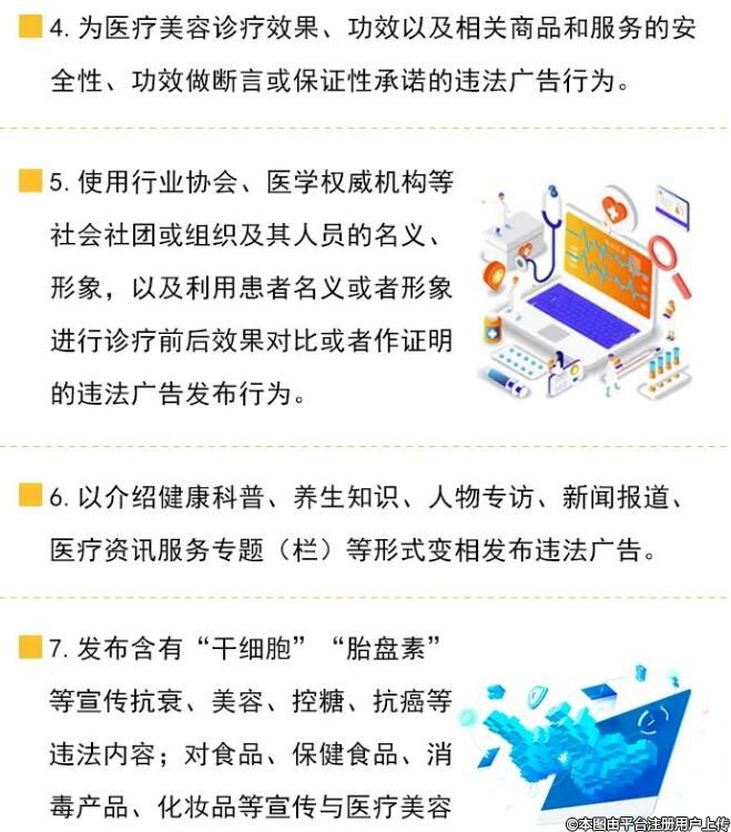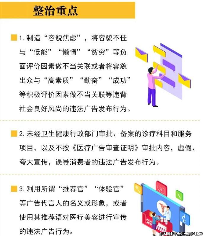 據(jù)了解,“清風行動”重點整治制造“容貌焦慮”,違背社會良好風尚的違法廣告發(fā)布行為;未經(jīng)衛(wèi)生健康行政部門審批、備案的診療科目和服務(wù)項目,虛假、夸大宣傳、誤導消費者的違法廣告發(fā)布行為;利用所謂“推薦官”“體驗官”等廣告代言人的名義或形象,或者使用其推薦語對醫(yī)療美容進行宣傳的違法廣告行為;使用行業(yè)協(xié)會、醫(yī)學權(quán)威機構(gòu)等社會社團或組織及其人員的名義、形象,以及利用患者名義或者形象進行診療前后效果對比或者作證明的違法廣告發(fā)布行為;以介紹健康科普、養(yǎng)生知識、人物專訪、新聞報道、醫(yī)療資訊服務(wù)專題(欄)等形式變相發(fā)布違法廣告等行為。
