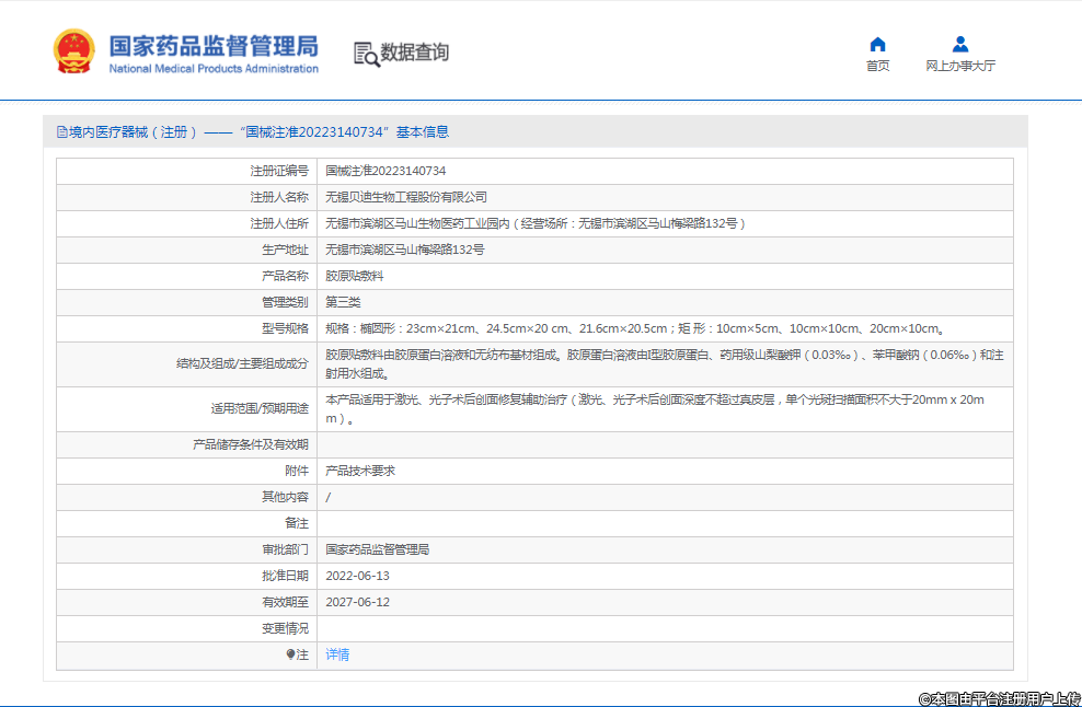 2022年6月13日,無錫貝迪生物工程股份有限公司(以下簡(jiǎn)稱“貝迪生物”)申報(bào)的“膠原貼敷料”正式獲得國(guó)家藥監(jiān)局批準(zhǔn),注冊(cè)證號(hào):國(guó)械注準(zhǔn)20223140734。