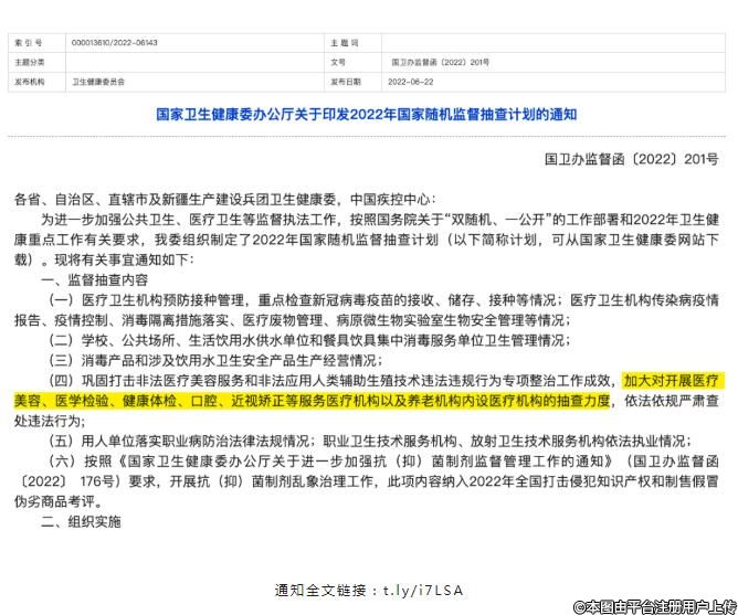 6月22日,國家衛(wèi)生健康委辦公廳印發(fā)2022年國家隨機監(jiān)督抽查計劃,監(jiān)督抽查內(nèi)容包括:醫(yī)療衛(wèi)生機構(gòu)預防接種管理,重點檢查新冠病毒疫苗的接收、儲存、接種等情況;醫(yī)療衛(wèi)生機構(gòu)傳染病疫情報告、疫情控制、消毒隔離措施落實、醫(yī)療廢物管理、病原微生物實驗室生物安全管理等情況;鞏固打擊非法醫(yī)療美容服務(wù)和非法應(yīng)用人類輔助生殖技術(shù)違法違規(guī)行為專項整治工作成效,加大對開展醫(yī)療美容、醫(yī)學檢驗、健康體檢、口腔、近視矯正等服務(wù)醫(yī)療機構(gòu)以及養(yǎng)老機構(gòu)內(nèi)設(shè)醫(yī)療機構(gòu)的抽查力度,依法依規(guī)嚴肅查處違法行為。