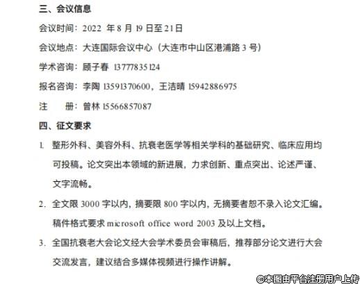 由中國(guó)整形美容協(xié)會(huì)抗衰老分會(huì)、中國(guó)整形美容協(xié)會(huì)培訓(xùn)部、大連市醫(yī)學(xué)會(huì)主辦,大連大學(xué)附屬新華醫(yī)院、大連醫(yī)科大學(xué)附屬第一院承辦的第七屆中國(guó)抗衰老醫(yī)學(xué)大會(huì)將于2022年8月19日至21日在遼寧省大連市舉行。