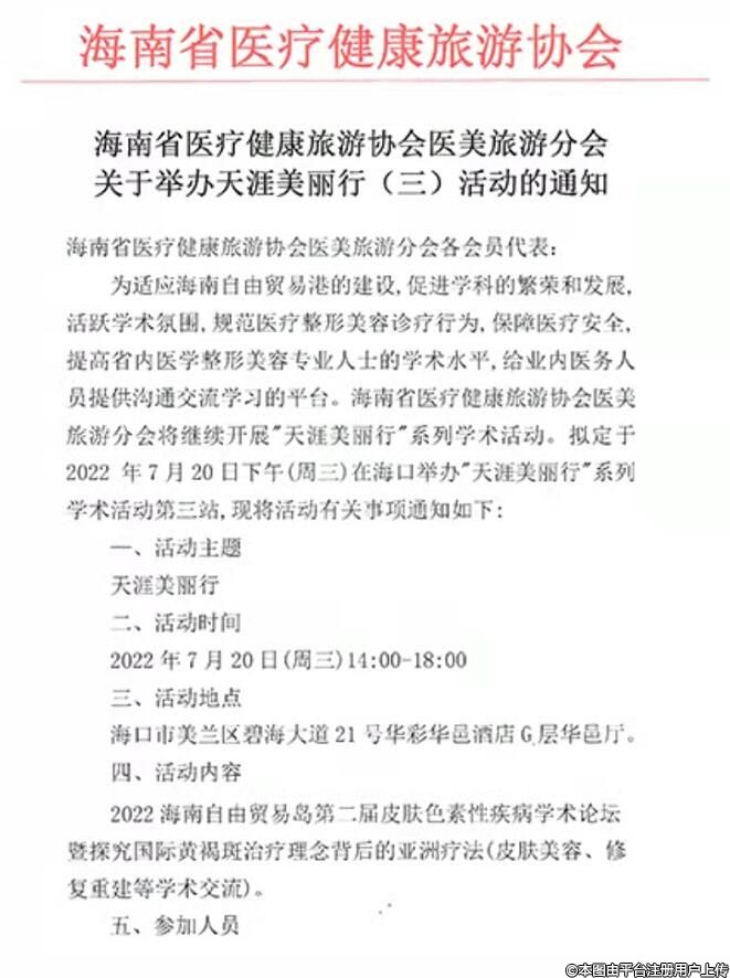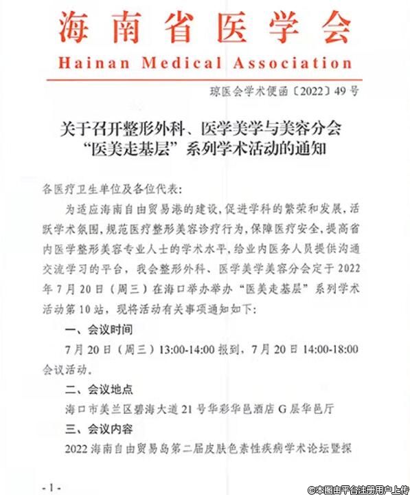 2022年7月20日14:00由海南省醫(yī)學會整形外科、醫(yī)學美學美容分會、海南紅瑞集團-紅妝尚醫(yī)學美容連鎖聯(lián)合主辦,海南省醫(yī)療健康旅游協(xié)會醫(yī)美旅游分會、海南科伊美生物科技有限公司協(xié)辦的2022海南自由貿(mào)易港第二屆皮膚色素性疾病學術(shù)論壇。將在??谌A彩華邑G層華邑廳盛大開啟。